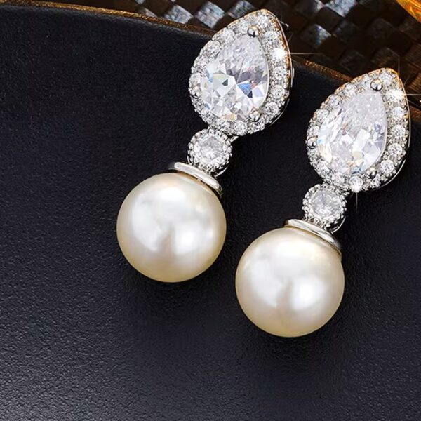 Ασημένια σκουλαρίκια μακριά με μαργαριτάρι σε σχήμα σταγόνας και ζιργκόν περιμετρικά