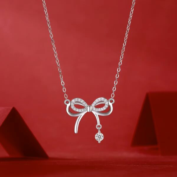 Ένα κολιέ που συνδυάζει διαχρονική κομψότητα με σύγχρονη λάμψη. Ο διπλός φιόγκος, φιλοτεχνημένος από ασήμι 925, αποπνέει θηλυκότητα και ρομαντισμό, ενώ οι λεπτομέρειες του σχεδίου τονίζουν την αίσθηση πολυτέλειας. Στο κέντρο του κοσμήματος δεσπόζει ένας εκθαμβωτικός μοϊσανίτης, γνωστός για τη φωτεινότητα και τη λάμψη του, που χαρίζει στο κολιέ μια αίσθηση διαμαντιού.