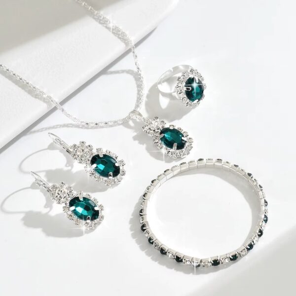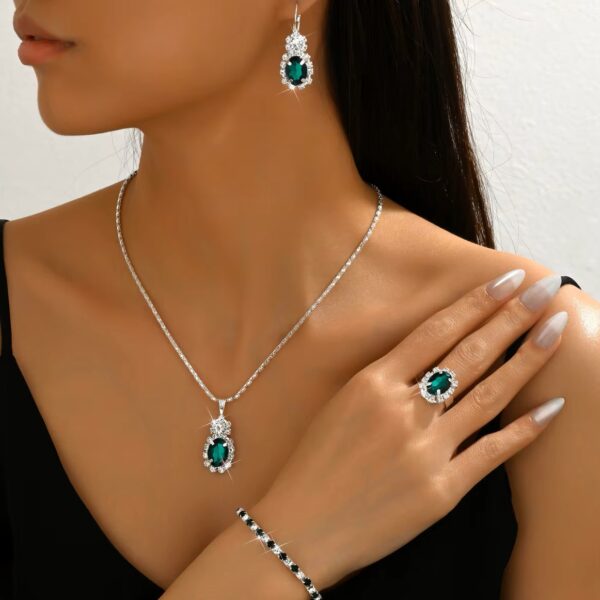 Αυτό το σετ κοσμημάτων περιλαμβάνει ένα δαχτυλίδι, ένα κολιέ, ένα ζευγάρι σκουλαρίκια και ένα βραχιόλι, όλα διακοσμημένα με εντυπωσιακές πράσινες οβάλ πέτρες στο κέντρο, περιτριγυρισμένες από λαμπερές λευκές πέτρες που θυμίζουν διαμάντια.