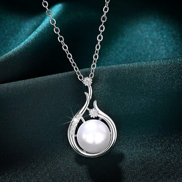 Γυναικείο κομψό κολιέ με λαμπερή ασημένια αλυσίδα και ένα εντυπωσιακό μενταγιόν σε σχήμα σταγόνας, διακοσμημένο στο κέντρο με ένα μεγάλο λευκό μαργαριτάρι.