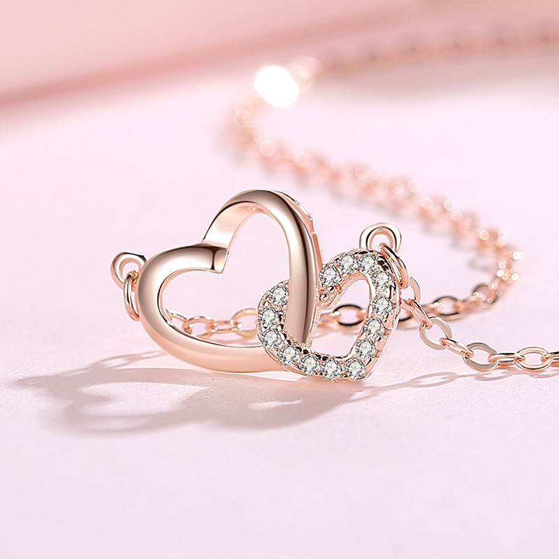 By Queen Γυναικείο Κολιέ Διπλή Καρδιά S925 Με Ζιργκόν Rose Gold