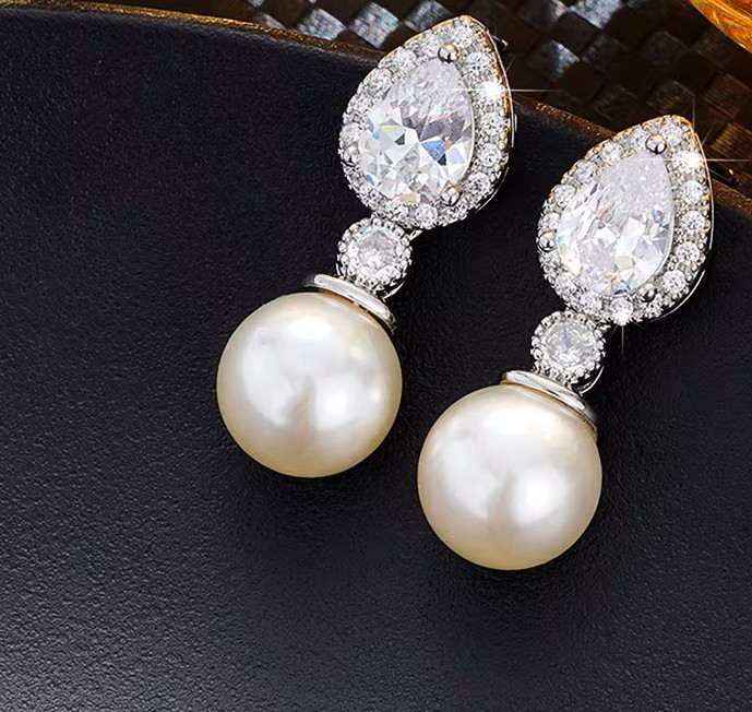 Ασημένια σκουλαρίκια μακριά με μαργαριτάρι σε σχήμα σταγόνας και ζιργκόν περιμετρικά