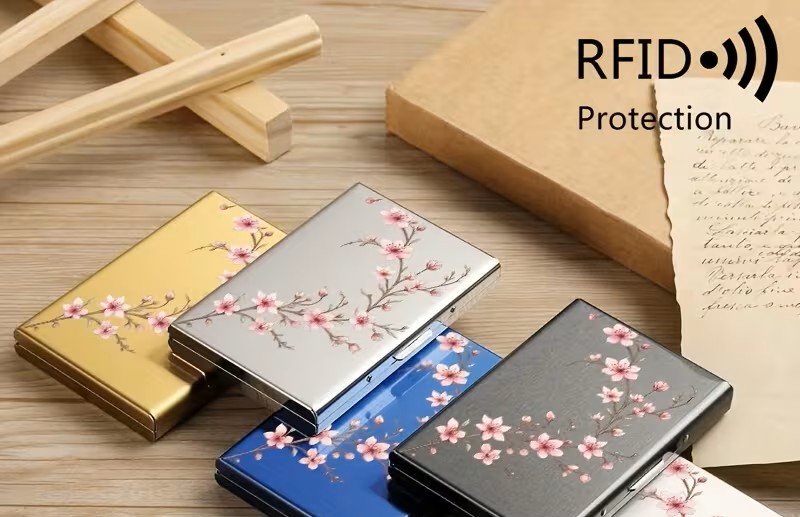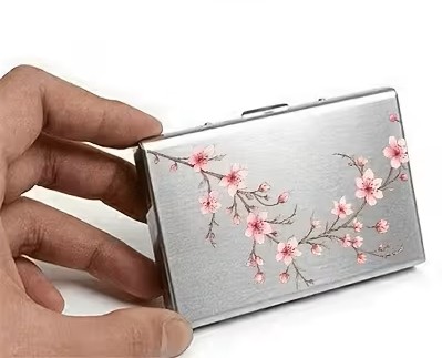 Μεταλλικό card holder με 6 θέσεις, RFID προστασία και floral cherry blossom σχέδιο. Κομψό, ασφαλές και ιδανικό για καθημερινή χρήση.