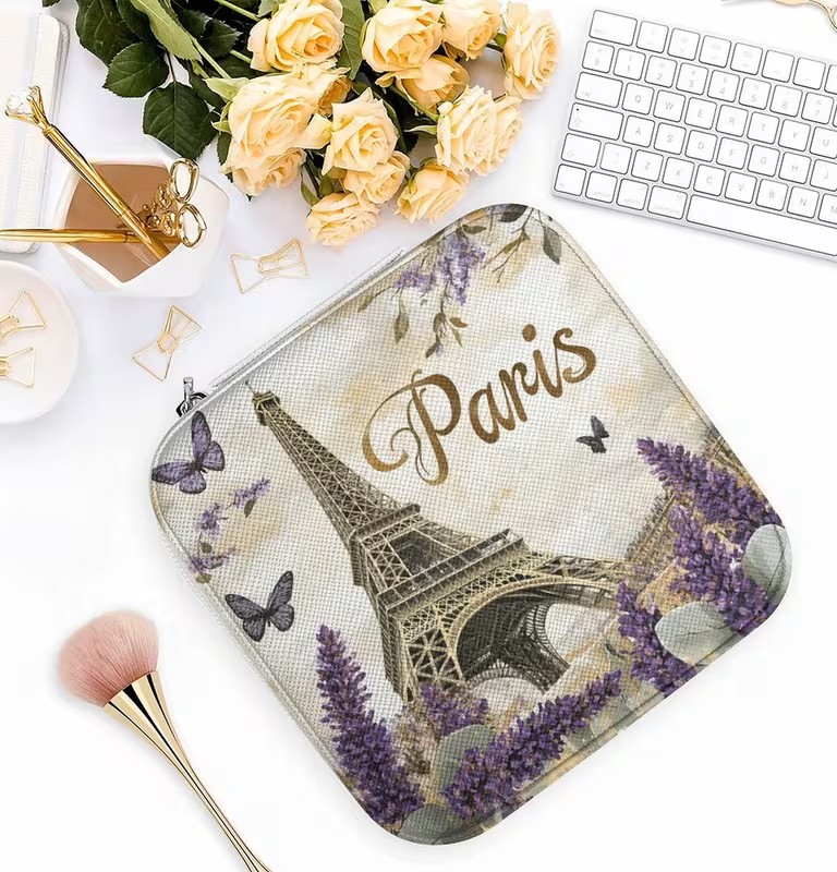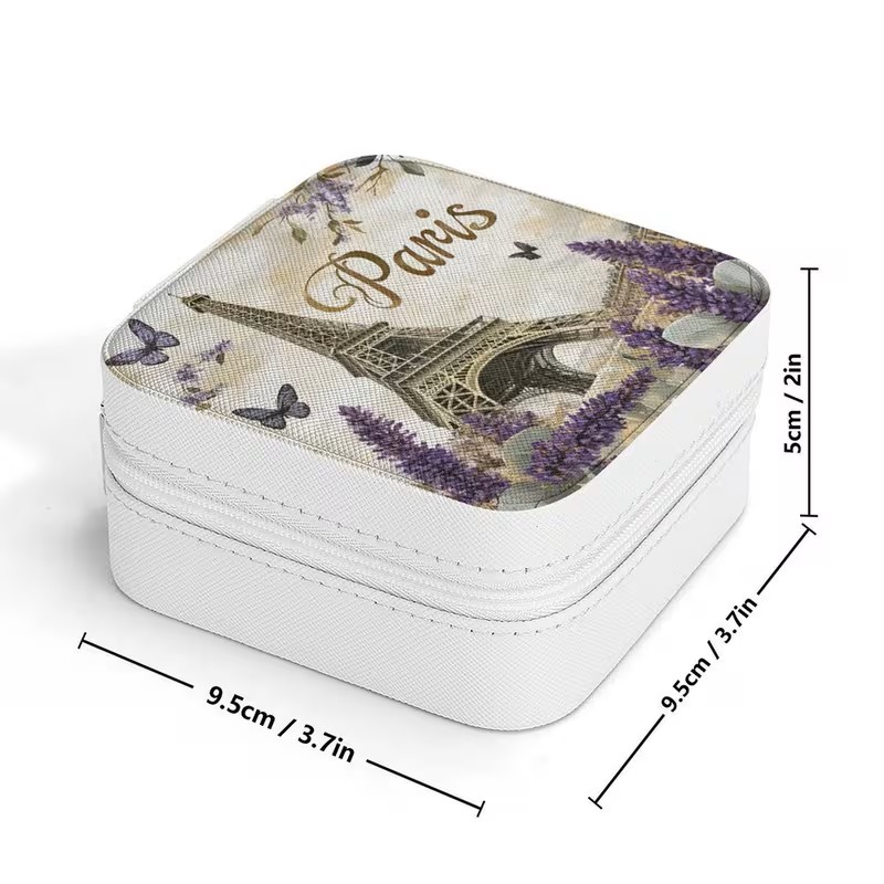 Η κοσμηματοθήκη “Paris Bloom” της By Queen είναι μια τετράγωνη θήκη με φερμουάρ, σχεδιασμένη για αποθήκευση κοσμημάτων με ρομαντική αισθητική. Το εξωτερικό της διακοσμείται με εικονογράφηση του Πύργου του Άιφελ, λεβάντες και πεταλούδες, σε pastel αποχρώσεις που αποπνέουν ταξιδιωτική νοσταλγία και θηλυκή κομψότητα.