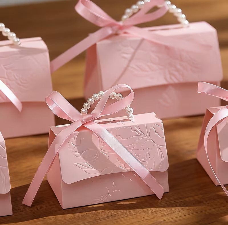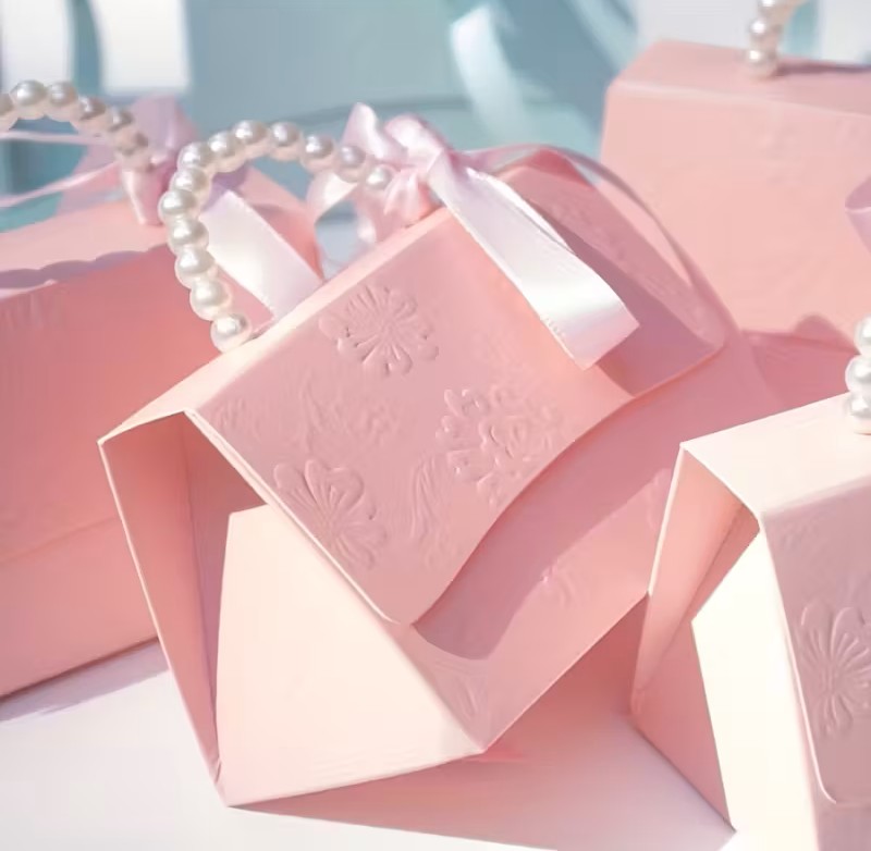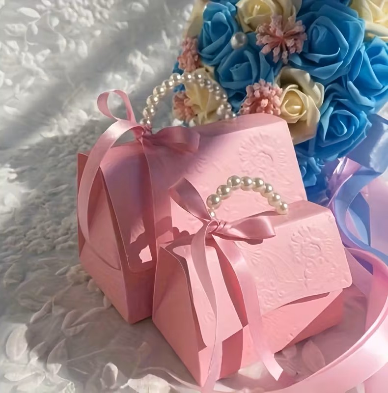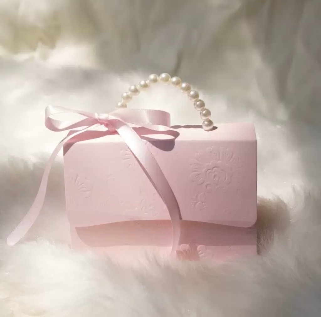 Κουτί δώρου σε σχήμα τσάντας με περλέ χερούλι, σατέν κορδέλα και ανάγλυφα λουλούδια. Ιδανικό για κοσμήματα και ρομαντική παρουσίαση.