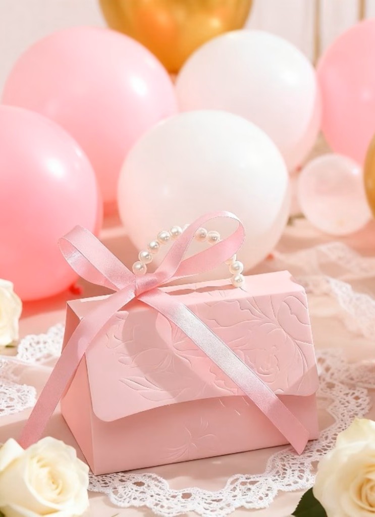κουτί δώρου σε σχήμα τσάντας με λουλούδια και πέρλες σε ροζ
