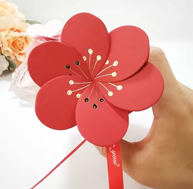 - Κόκκινο κουτί με χρυσή γραφή και καπάκι σε σχήμα λουλουδιού