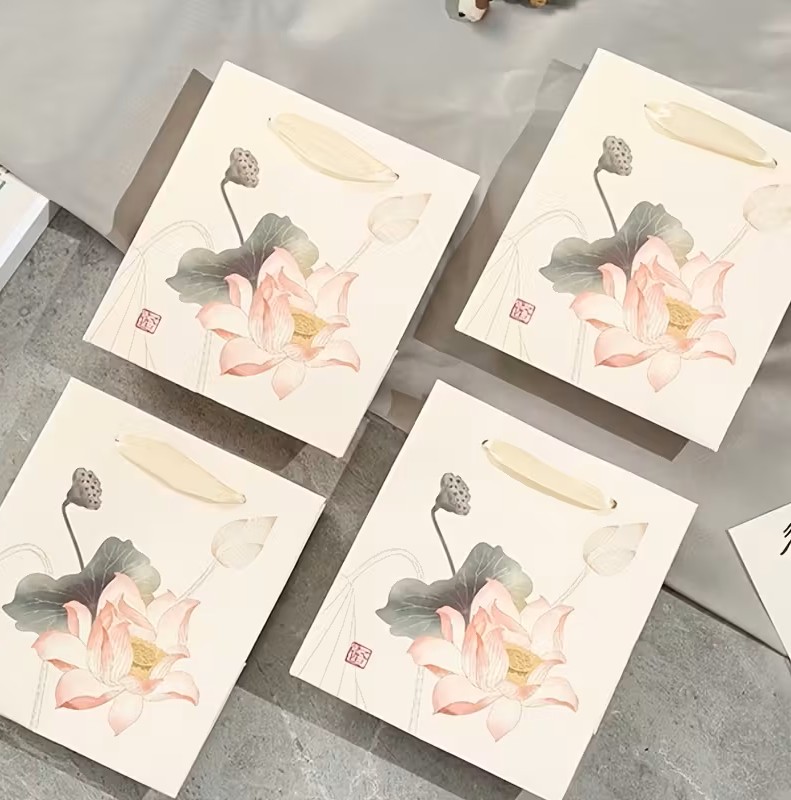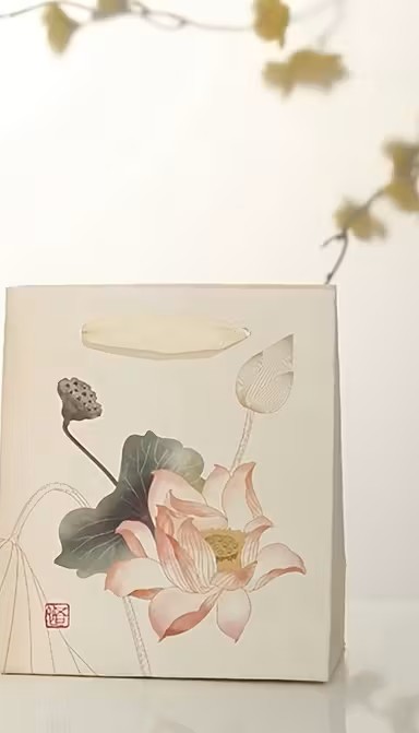 Premium σακουλάκι δώρου με εικονογράφηση λωτού και παραδοσιακή σφραγίδα. Ιδανικό για κοσμήματα και artistic gifting.