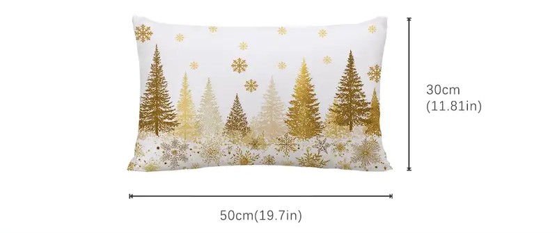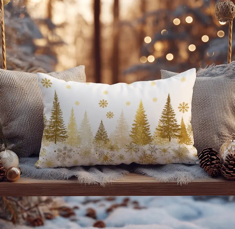 Ανακαλύψτε τη μαγεία του χειμώνα μέσα από μια μαξιλαροθήκη που συνδυάζει κομψότητα, ζεστασιά και γιορτινή φαντασία. Το σχέδιο με χρυσαφένια και πράσινα έλατα πάνω σε λευκό χιονισμένο φόντο, πλαισιωμένο από νιφάδες και λαμπερές λεπτομέρειες, δημιουργεί μια ατμόσφαιρα γαλήνης και refined πολυτέλειας.