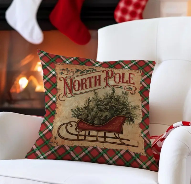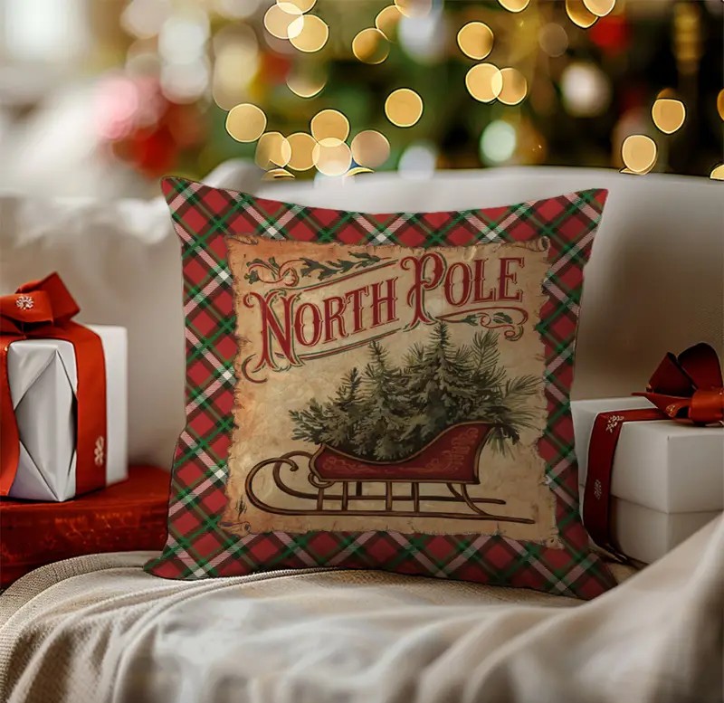 Ανακαλύψτε τη γοητεία των γιορτών μέσα από ένα μαξιλάρι που αποπνέει νοσταλγία, θαλπωρή και παραμυθένια ατμόσφαιρα. Η επιγραφή “North Pole” με διακοσμητικά στοιχεία προσθέτει μια παιχνιδιάρικη αλλά κομψή πινελιά που συνδυάζει ένα vintage κόκκινο έλκηθρο γεμάτο evergreen δέντρα με ένα καρό πλαίσιο σε αποχρώσεις του κόκκινου, του πράσινου και του μπεζ, δημιουργώντας μια σκηνή που θυμίζει καρτ ποστάλ από μια χιονισμένη γιορτινή νύχτα.
