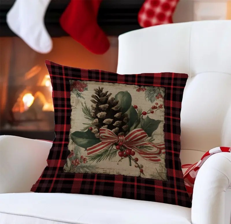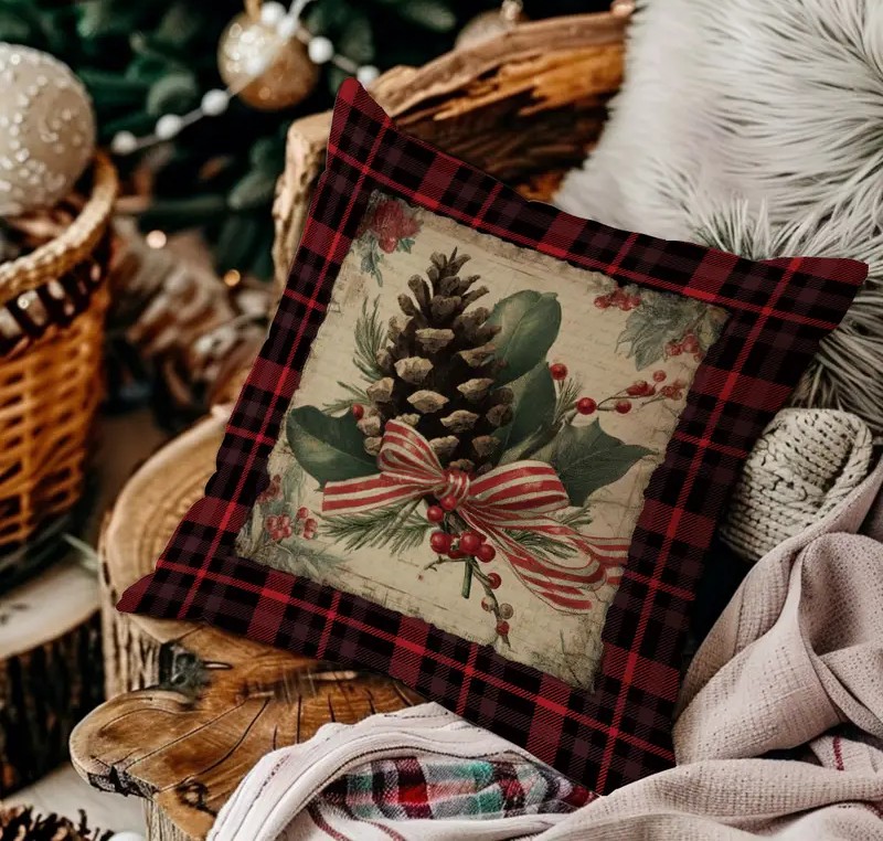 Αναδείξτε τη φυσική γοητεία των γιορτών με ένα μαξιλάρι που συνδυάζει παραδοσιακή αισθητική και rustic κομψότητα. Το “Plaid Pinecone” της By Queen διαθέτει καρό περίγραμμα σε κόκκινο και μαύρο, που πλαισιώνει ένα κεντρικό σχέδιο με κουκουνάρι, πράσινα φύλλα, κόκκινα μούρα και μια ριγέ κόκκινη-λευκή κορδέλα, αποτυπωμένα σε φόντο με υφή περγαμηνής.