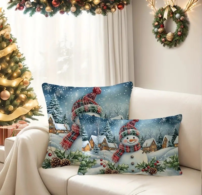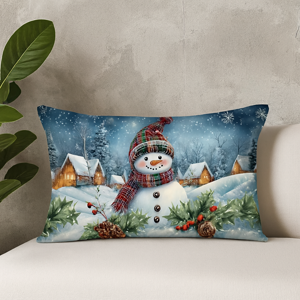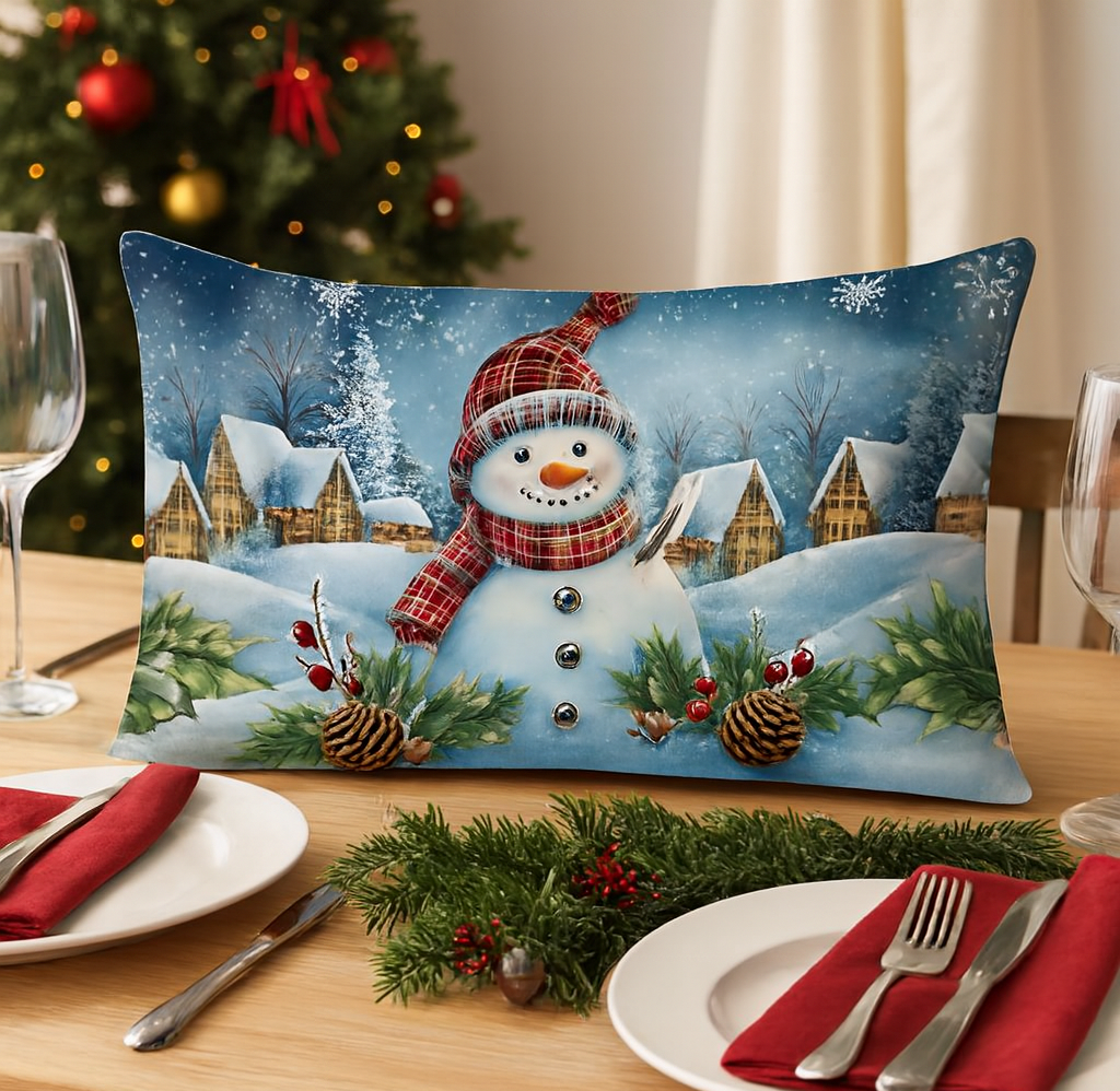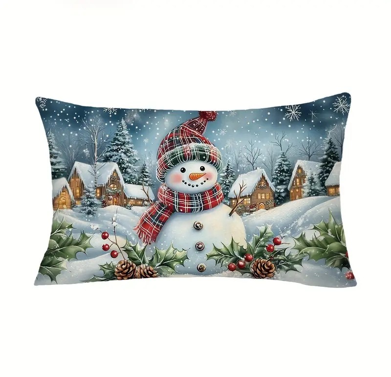 Η πιο χαρούμενη φιγούρα των Χριστουγέννων ζωντανεύει μέσα από τη limited edition μαξιλαροθήκη Snowman Village. Ένας γλυκός χιονάνθρωπος με καρό καπέλο και κασκόλ στέκεται μπροστά σε ένα χιονισμένο χωριό με φωτισμένα σπιτάκια, έλατα και γιορτινή ατμόσφαιρα. Οι λεπτομέρειες με φύλλα γκι, κόκκινες ρώγες και κουκουνάρια ολοκληρώνουν το σχέδιο, δημιουργώντας μια εικόνα που αποπνέει θαλπωρή και παιδική χαρά.