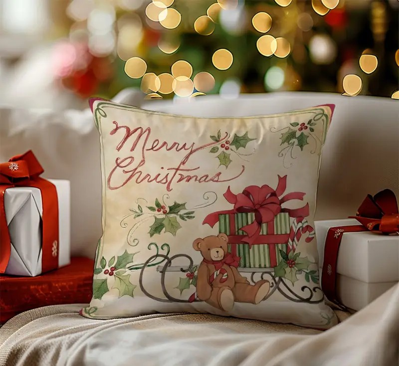 By Queen Limited Festive Edition Μαξιλαροθήκη Merry Christmas Με Αρκουδάκι & Δώρο 45x45εκ. - Byqueen