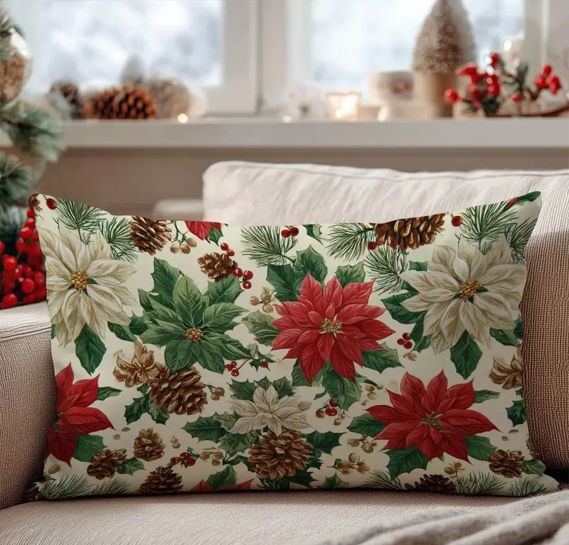 Η διαχρονική κομψότητα των Χριστουγέννων αποτυπώνεται σε μια μαξιλαροθήκη που συνδυάζει την πολυτέλεια με τη ζεστασιά. Το σχέδιο με κόκκινα και λευκά αλεξανδρινά, κουκουνάρια και festive φύλλωμα δημιουργεί μια ατμόσφαιρα γιορτινής αρμονίας, ενώ οι λεπτομέρειες σε έντονες αποχρώσεις προσδίδουν αίσθηση αυθεντικότητας και premium χαρακτήρα.