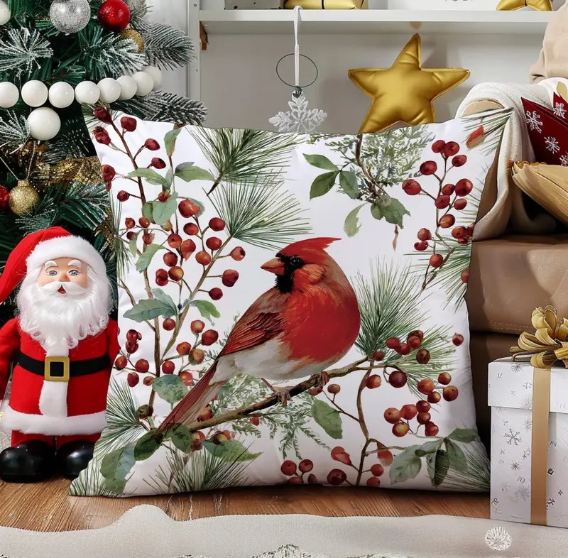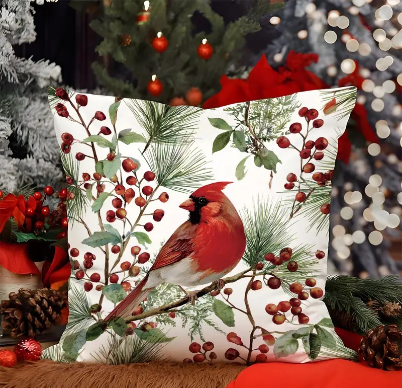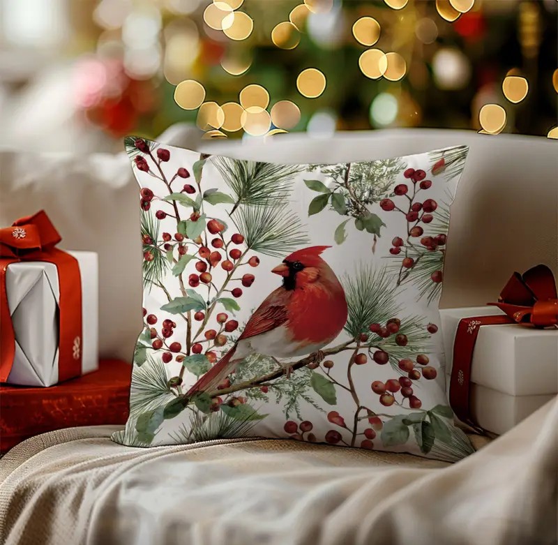Το πιο τρυφερό στοιχείο της χριστουγεννιάτικης διακόσμησης – ένα μαξιλάρι που αγκαλιάζει τη θαλπωρή, με τον καρδινάλιο να συμβολίζει την ελπίδα και τη ζεστασιά των γιορτών.