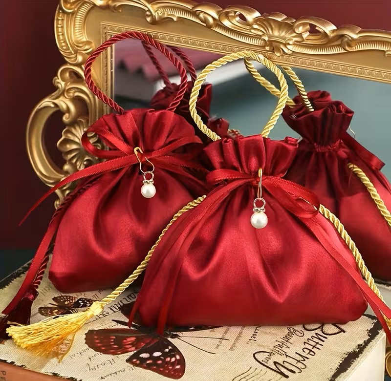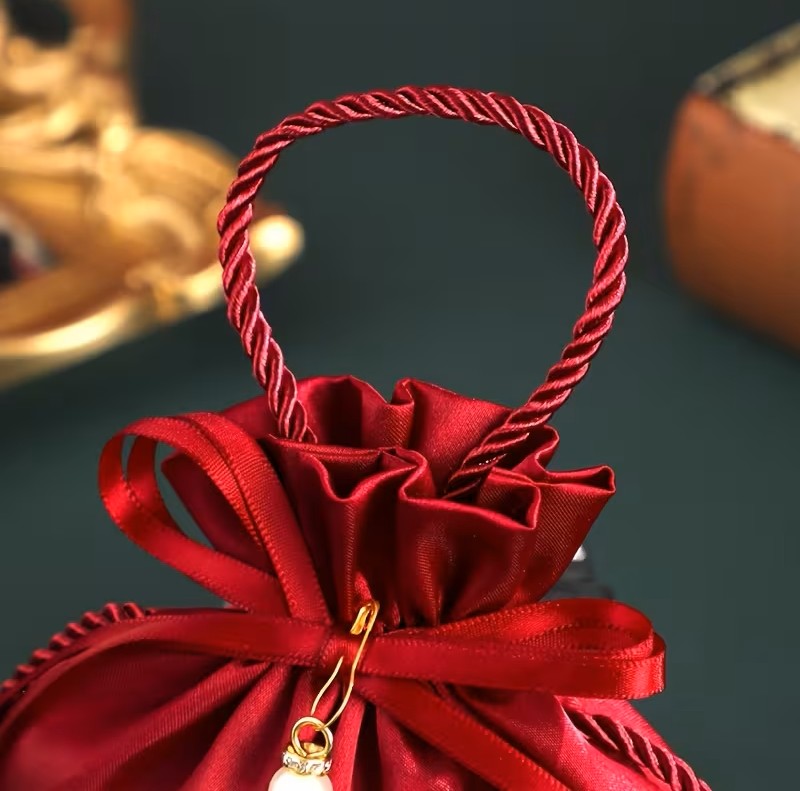 Ένα πουγκί δώρου με σατέν υφή και περλέ λεπτομέρεια που αποπνέει πολυτέλεια, φροντίδα και τελετουργική αισθητική.