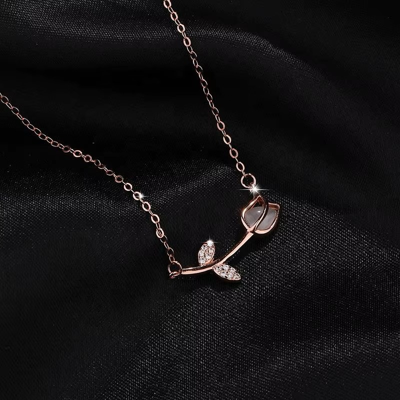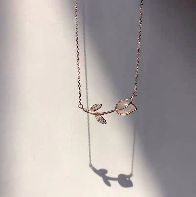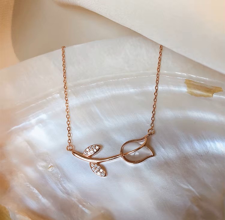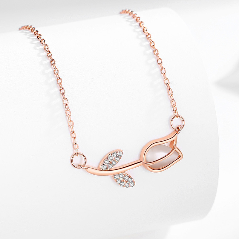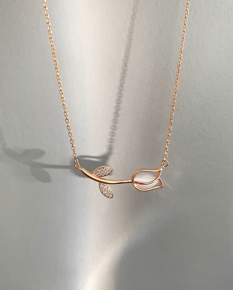 Ροζ χρυσό κολιέ τουλίπα ByQueen με δύο φύλλα διακοσμημένα με ζιργκόν. Ζεστό, ρομαντικό και θηλυκό.