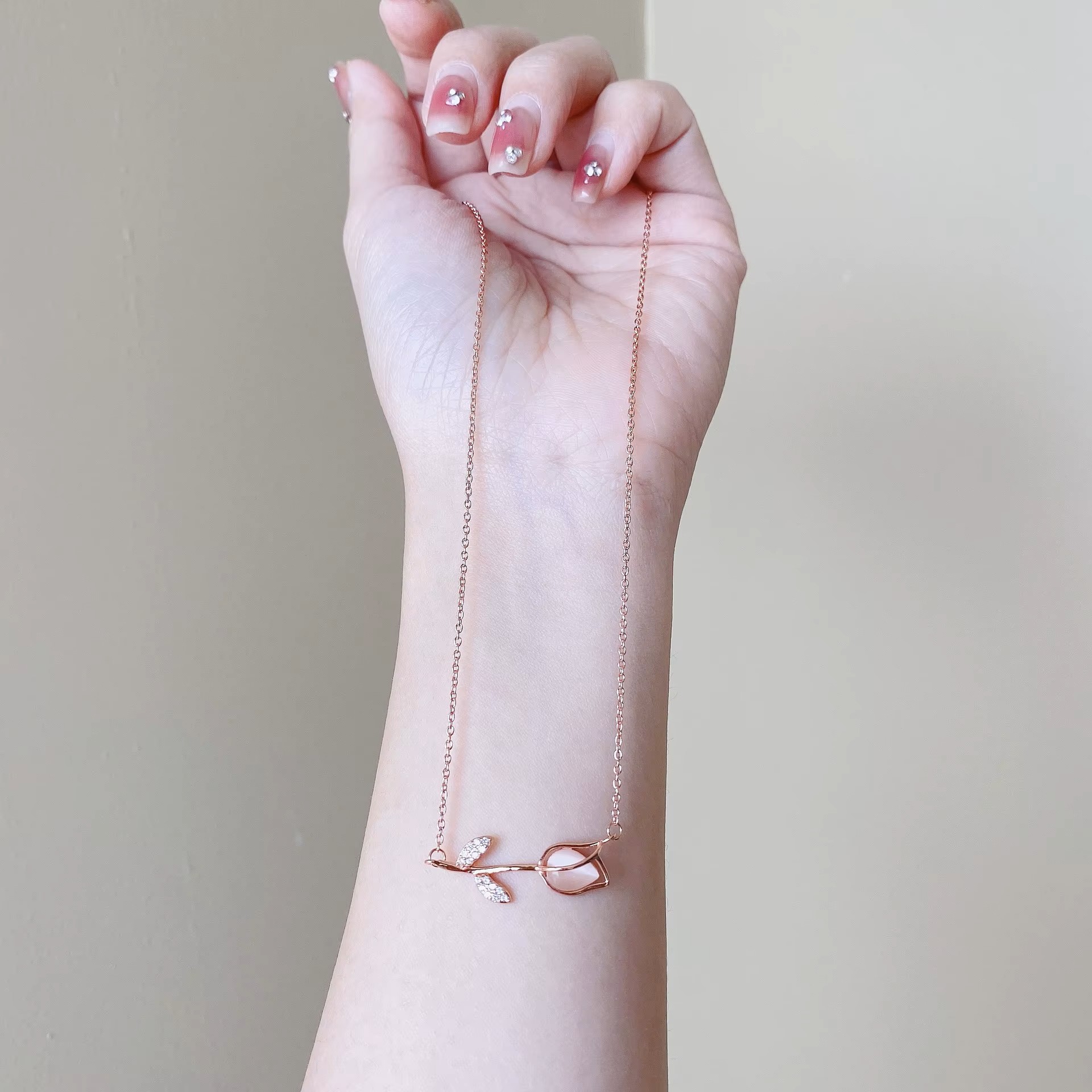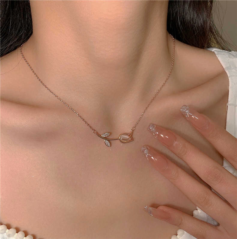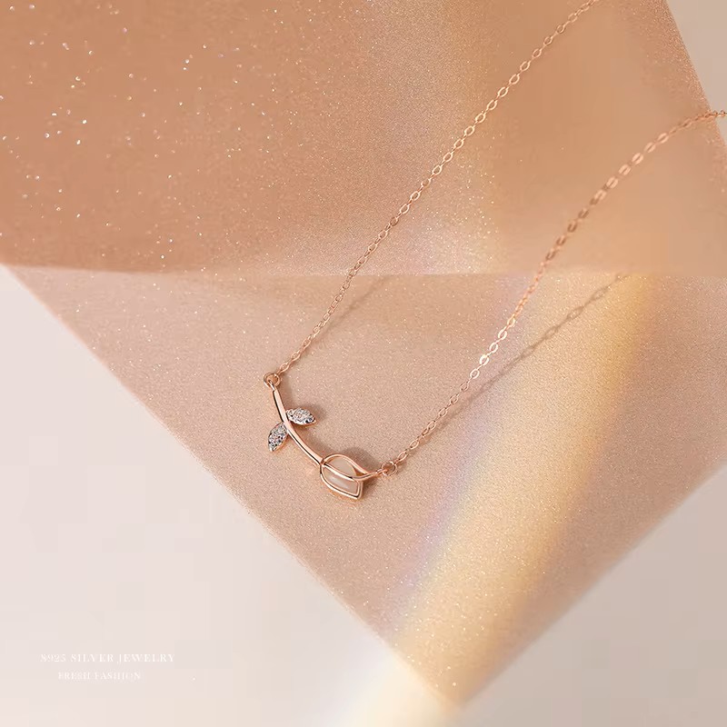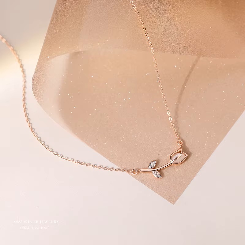 Ροζ χρυσό κολιέ τουλίπα ByQueen με δύο φύλλα διακοσμημένα με ζιργκόν. Ζεστό, ρομαντικό και θηλυκό.