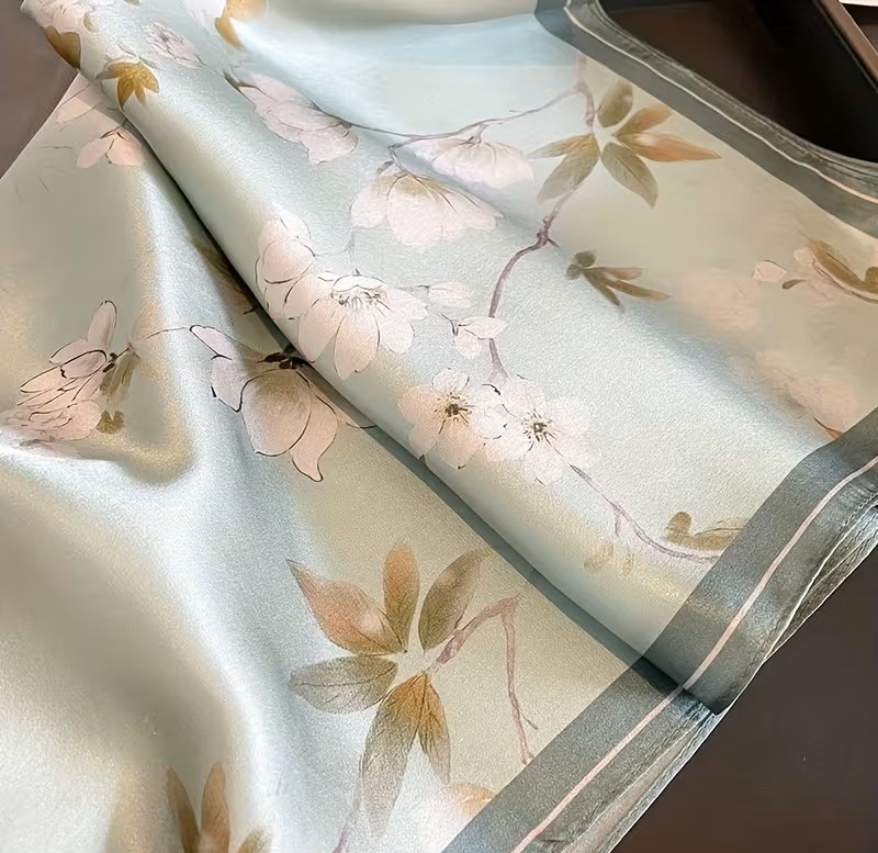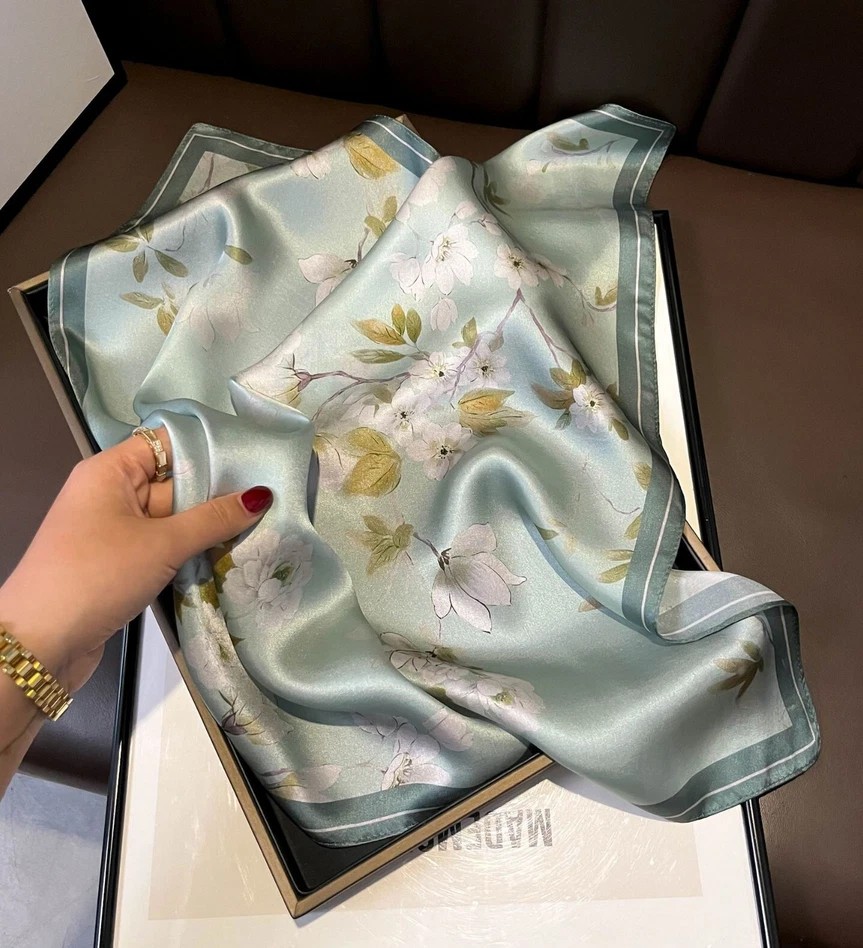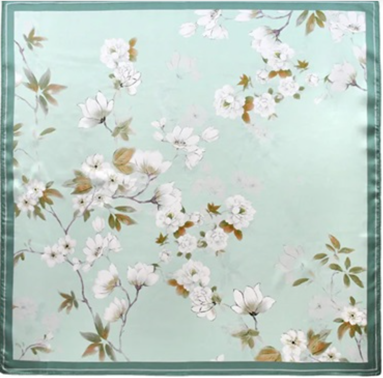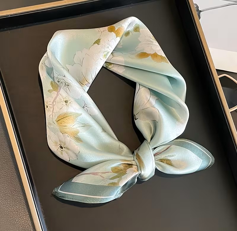Αναδείξτε τη φρεσκάδα και την κομψότητα σας με αυτό το premium σατέν φουλάρι By Queen. Το απαλό πράσινο φόντο, τα λευκά άνθη και το σκούρο περίγραμμα δημιουργούν μια φυσική, ρομαντική αισθητική που ταιριάζει σε κάθε εποχή. Η απαλή, γυαλιστερή υφή του σατέν προσφέρει άνεση και πολυτέλεια, ενώ η ευελιξία του το καθιστά ιδανικό για λαιμό, μαλλιά ή τσάντα. Ένα αξεσουάρ που συνδυάζει φινέτσα και statement στιλ.