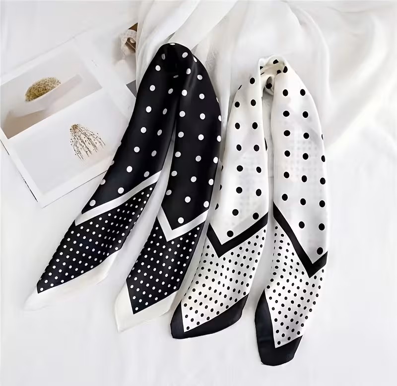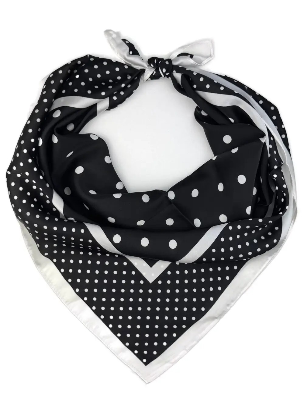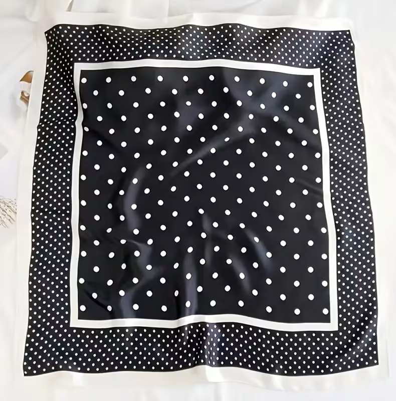 Σατέν μαντήλι με λευκά polka dots σε μαύρο φόντο και διπλό περίγραμμα. Απαλή υφή, retro αισθητική και ευέλικτο styling για λαιμό, μαλλιά ή τσάντα.