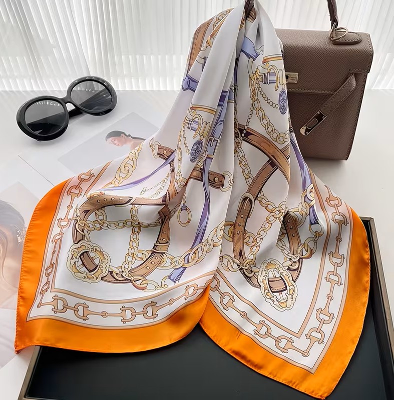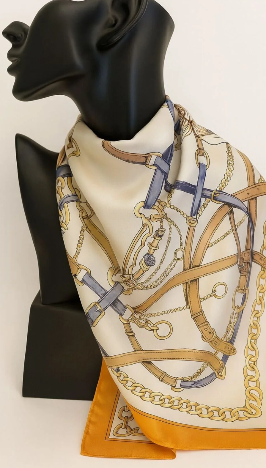 Ένα φουλάρι που αποπνέει δυναμισμό, φινέτσα και διαχρονική κομψότητα. Το equestrian σχέδιο με αλυσίδες, κρίκους, ζώνες και αναβολείς δημιουργεί μια αρμονική σύνθεση που θυμίζει την αισθητική των κλασικών οίκων μόδας. Το λευκό φόντο φωτίζει τις χρυσές λεπτομέρειες, ενώ το πορτοκαλί περίγραμμα προσθέτει μια statement πινελιά που κάνει το αξεσουάρ να ξεχωρίζει.Η απαλή, μεταξένια υφή του σατέν προσφέρει πολυτέλεια και άνεση, ενώ η ευελιξία του το καθιστά ιδανικό για λαιμό, μαλλιά ή τσάντα. Ένα κομμάτι που ολοκληρώνει κάθε εμφάνιση από καθημερινή μέχρι βραδινή με στιλ και αυτοπεποίθηση.