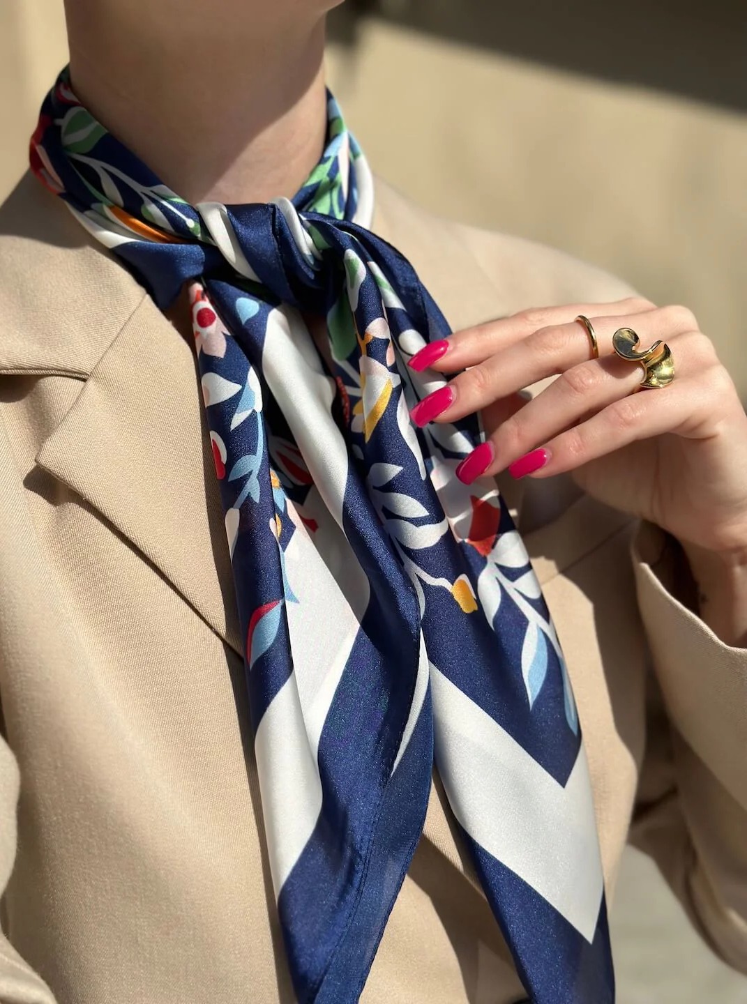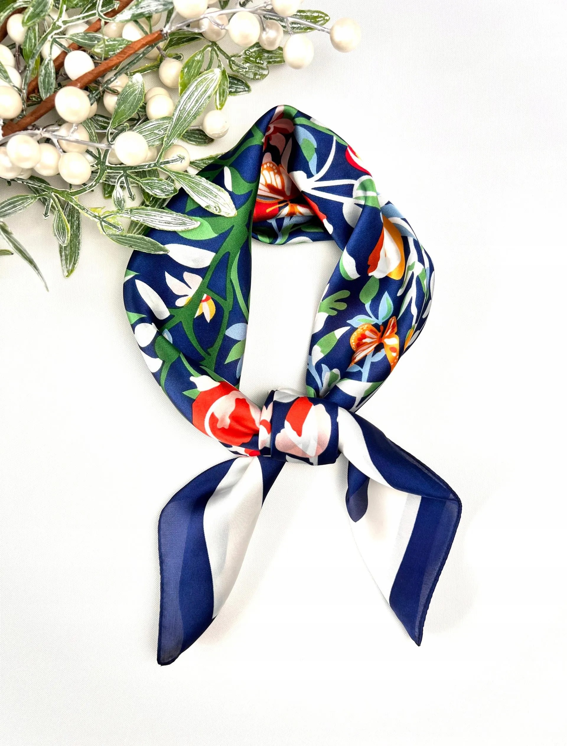 Statement σατέν φουλάρι με πεταλούδες και λουλούδια σε σκούρο μπλε φόντο. Πολυτελές, έντονο και κομψό — ιδανικό για λαιμό, μαλλιά ή τσάντα.