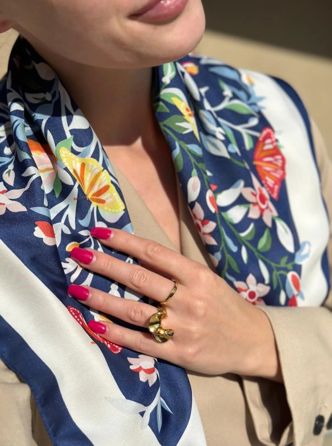 Το σατέν φουλάρι By Queen με πεταλούδες και λουλούδια είναι μια statement επιλογή για γυναίκες που αγαπούν το χρώμα, την ένταση και την κομψότητα. Το φόντο σε βαθύ μπλε δημιουργεί αντίθεση με τα ζωηρά floral μοτίβα σε κόκκινο, πορτοκαλί, ροζ και κίτρινο, ενώ οι πεταλούδες προσθέτουν κίνηση και φαντασία στη σύνθεση.