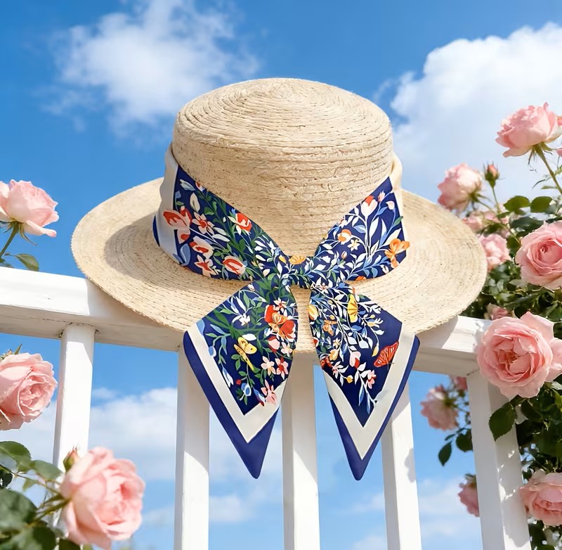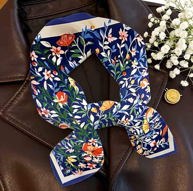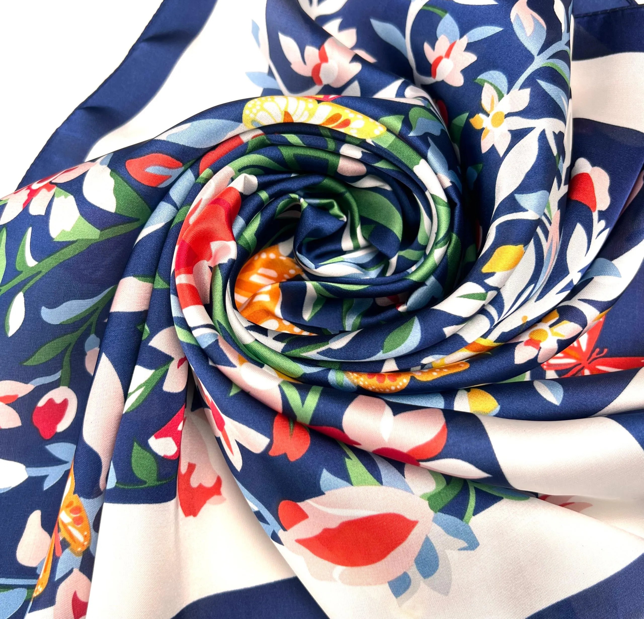Statement σατέν φουλάρι με πεταλούδες και λουλούδια σε σκούρο μπλε φόντο. Πολυτελές, έντονο και κομψό — ιδανικό για λαιμό, μαλλιά ή τσάντα.