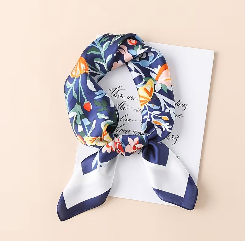 Το σατέν φουλάρι By Queen με πεταλούδες και λουλούδια είναι μια statement επιλογή για γυναίκες που αγαπούν το χρώμα, την ένταση και την κομψότητα. Το φόντο σε βαθύ μπλε δημιουργεί αντίθεση με τα ζωηρά floral μοτίβα σε κόκκινο, πορτοκαλί, ροζ και κίτρινο, ενώ οι πεταλούδες προσθέτουν κίνηση και φαντασία στη σύνθεση.